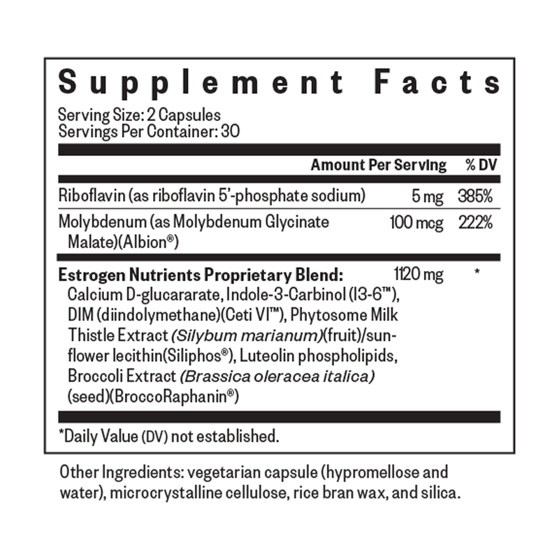 Frustrated by single-ingredient formulas that don't address the whole picture? Estrogen metabolism requires support at every stage. This formula provides Luteolin Phospholipids for aromatase support, I3-6™ and Ceti VI™ DIM for Phase I 2-hydroxylation, Calcium D-Glucarate and Siliphos® for Phase II glucuronidation, Albion® Molybdenum for sulfite processing, and BroccoRaphanin® with riboflavin for a healthy response to reactive metabolites.†