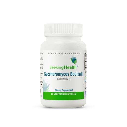 Supplement container labeled 'Saccharomyces Boulardii' by Seeking Health on a white background