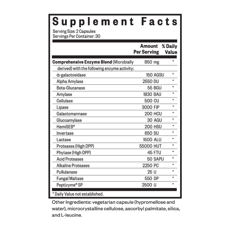 • Supports normal digestion of protein, fats, carbs, lactose, legumes, seeds, nuts, and gliadin from gluten