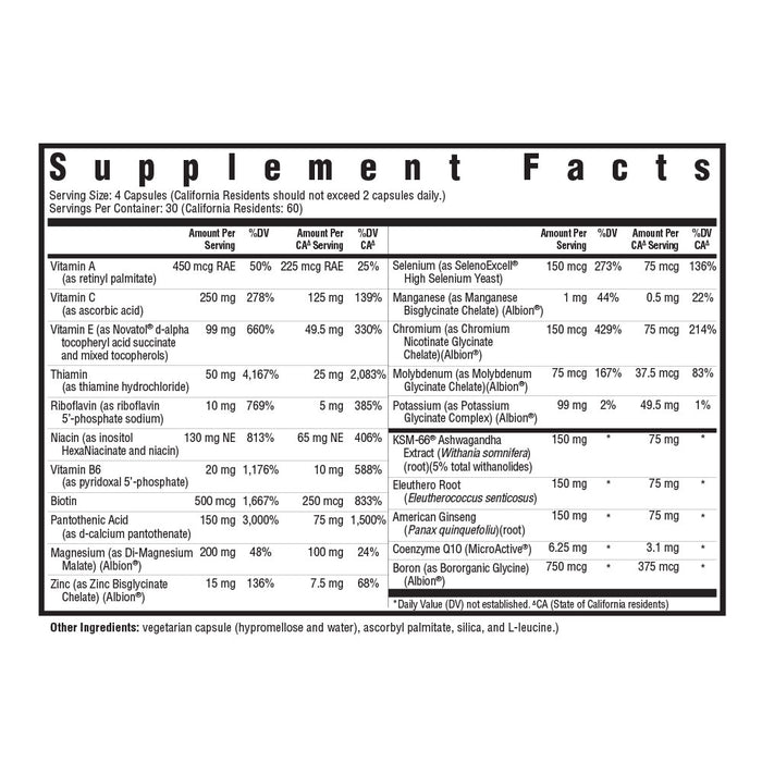 Supports the healthy and normal functioning of cells responsible for immune response, inflammatory signaling, and oxidative stress. Aids in cortisol regulation and utilization of B vitamins.